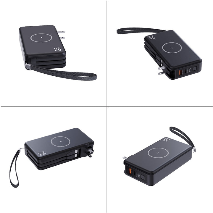 π Multiple Charging Interfaces β Includes Type-C input/output, USB-A, wireless charging pad, and built-in charging cables (Type-C and Lightning-style).